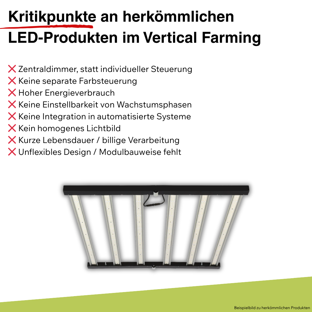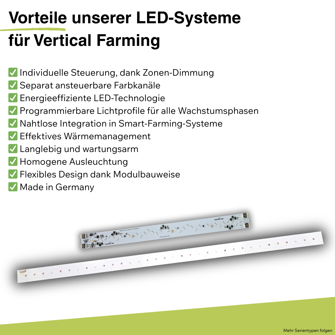 So erhält jede Pflanze über den gesamten Lebenszyklus hinweg genau das Licht, das für stabiles Wachstum, hohe Qualität und einen effizienten Energieeinsatz erforderlich ist — individuell konfigurierbar.