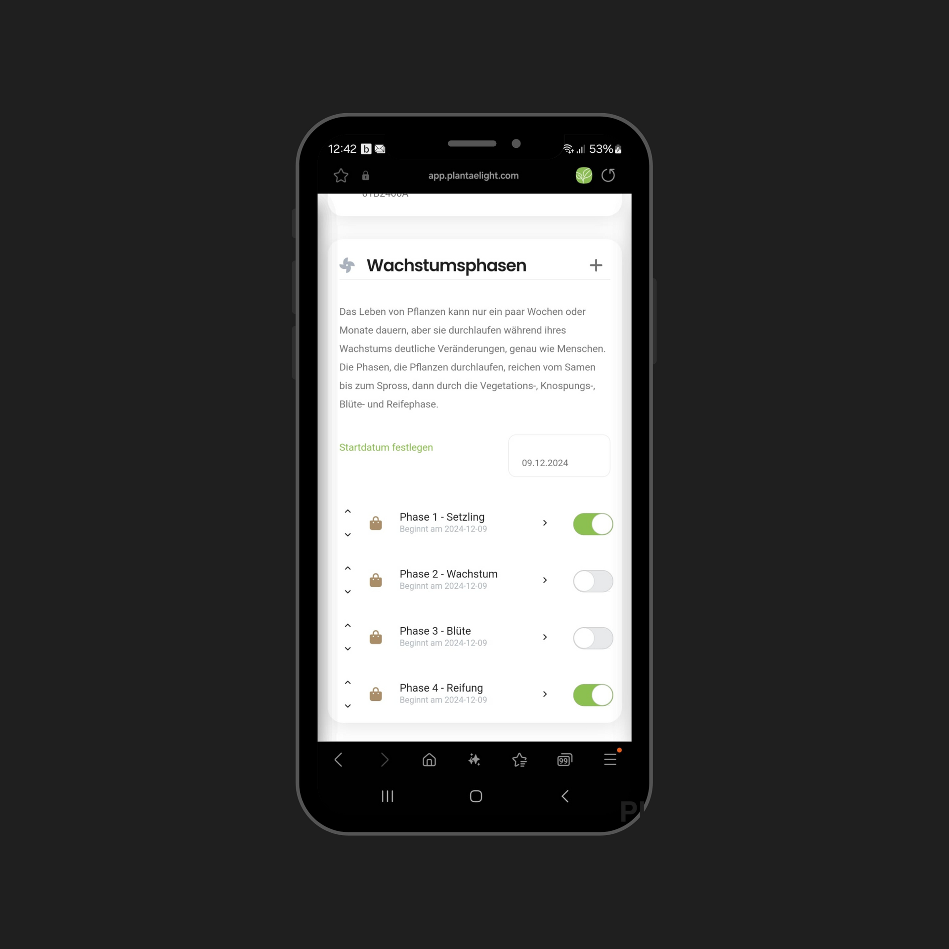 Die benutzerfreundliche App ermöglicht eine präzise Steuerung aller relevanten Beleuchtungsparameter – ganz einfach per Smartphone oder Tablet. So lassen sich Lichtintensität, Farbtemperatur und Tageszyklen individuell auf die Bedürfnisse der Pflanzen abstimmen.